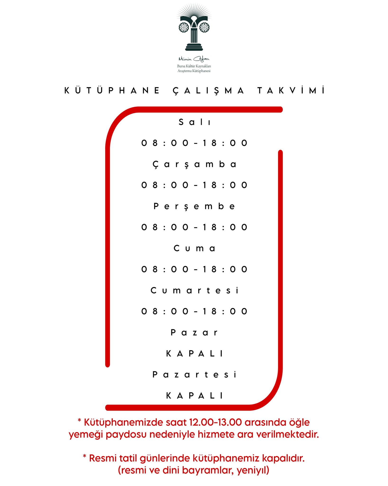 Kütüphanemiz her Pazar, Pazartesi ve resmi tatil günleri hariç olmak üzere; Salı, Çarşamba, Perşembe, Cuma ve Cumartesi 08.00-18.00 saatleri arasında hizmet vermektedir. (Çalışma günlerinde saat 12.00'den 13.00'e, yemek molası nedeniyle hizmete ara verilmektedir.)